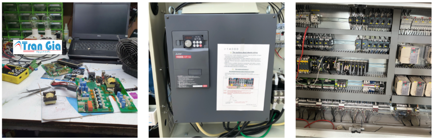 Dưới đây là một số hình ảnh thiết bị biến tần đang được sửa chữa tại TRAN GIA